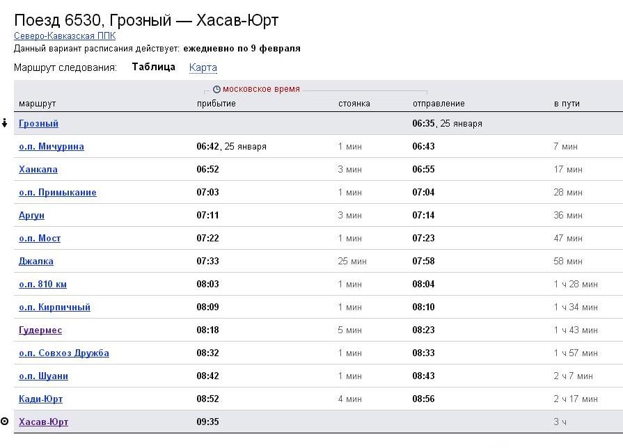 Пригородный поезд Грозный — Хасав-Юрт, «Яндекс-Расписания», январь 2014 года.